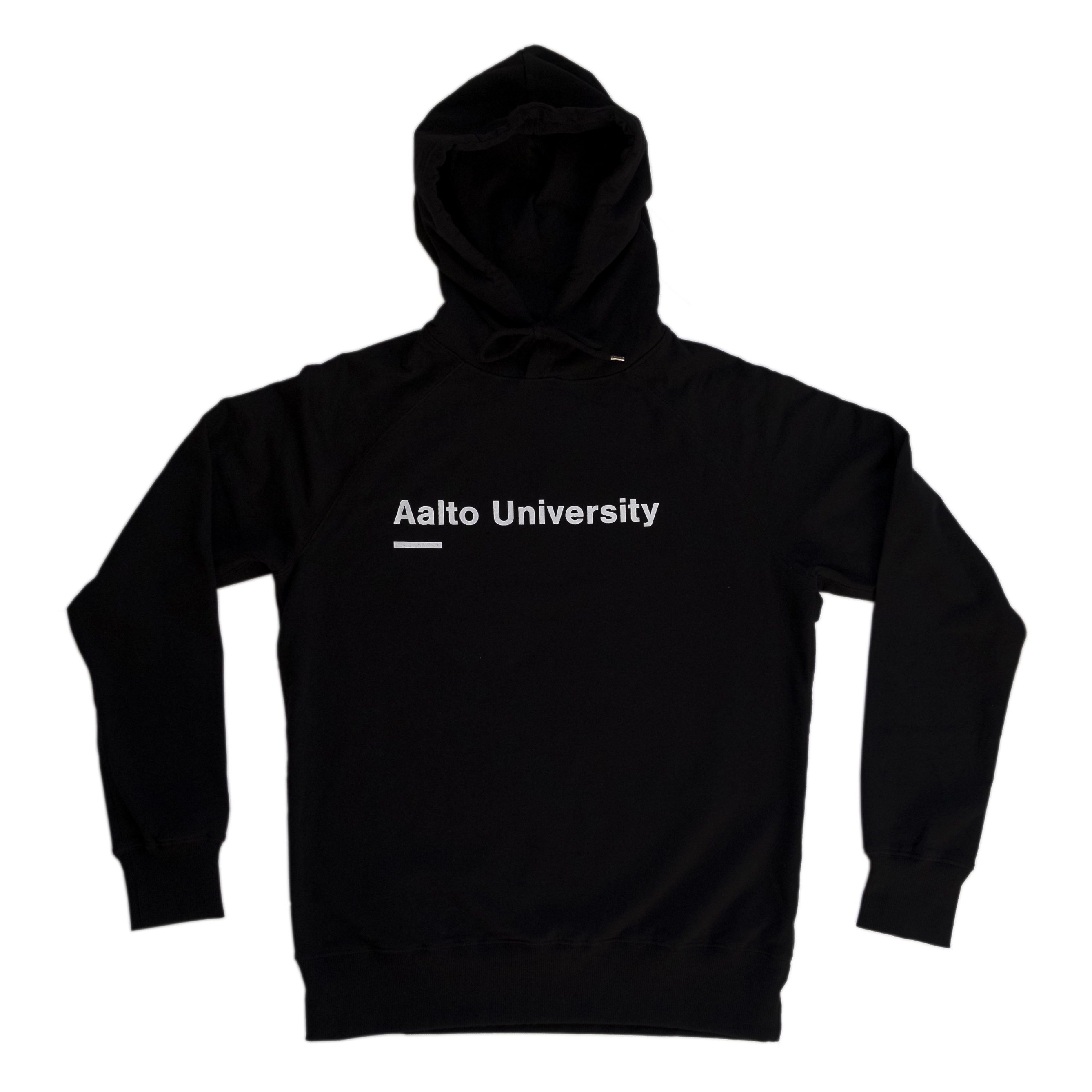 Pure Wasten musta huppari, jossa Aalto University -printti. Hupparit valmistetaan kierrätetystä ylijäämämateriaalista ja niitä on saatavilla mustana ja harmaana.
