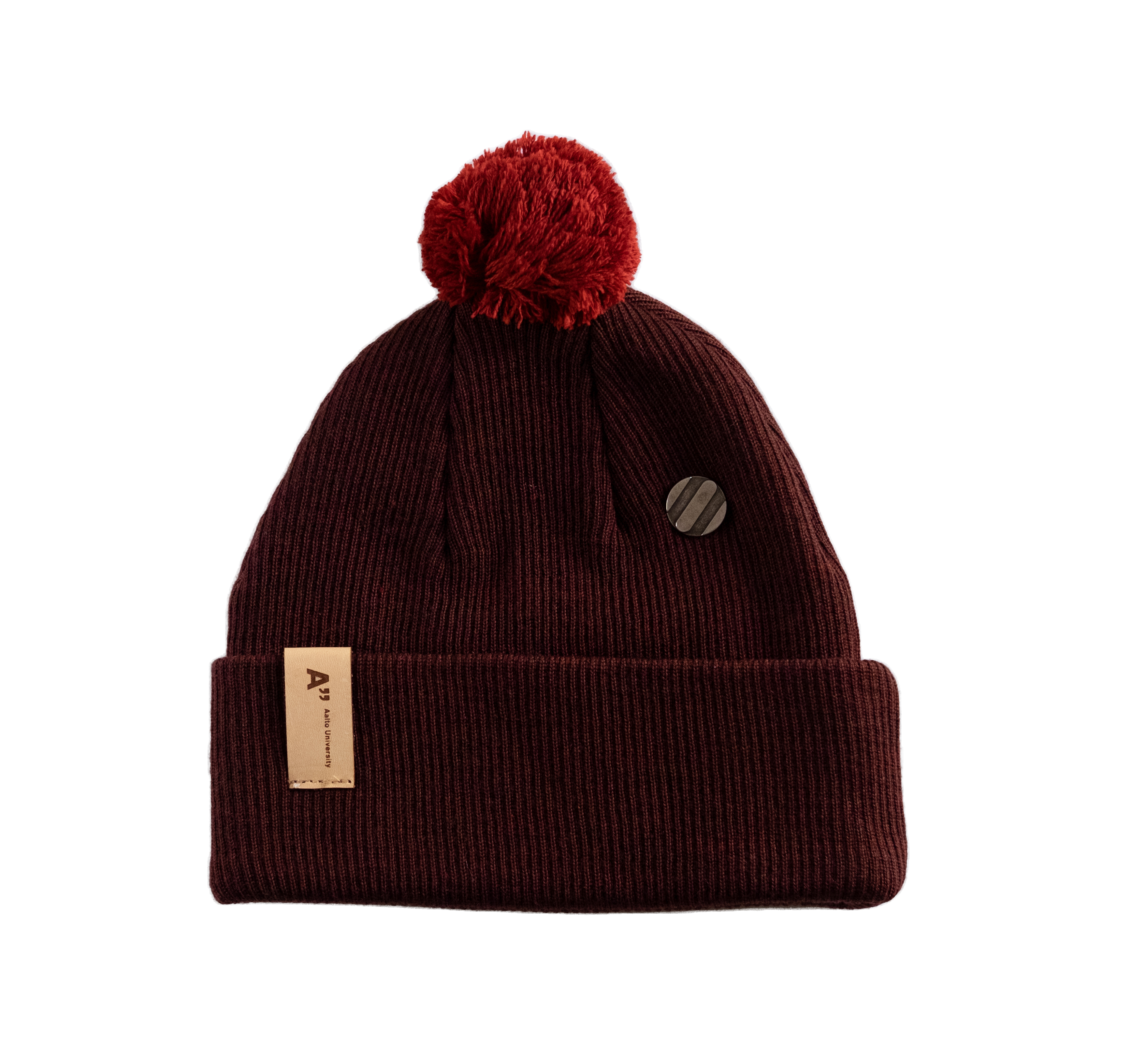 Pipo, jossa irrottettava tupsu ja Aalto-yliopiston logo. Valmistettu Suomessa.