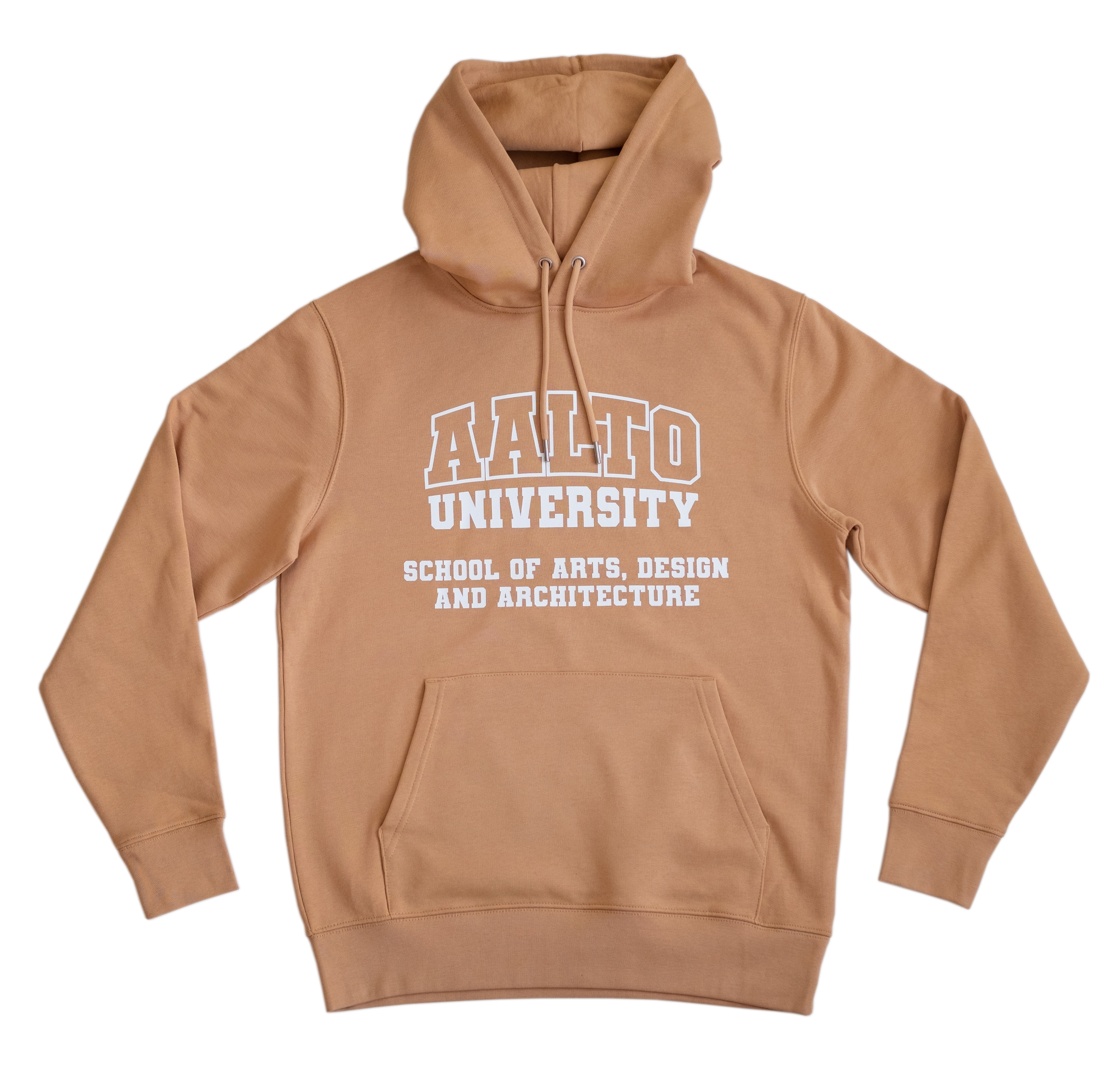 Luomupuuvillasta valmistettu huppari, jossa Aalto University School of Arts, Design and Architecture -printti.