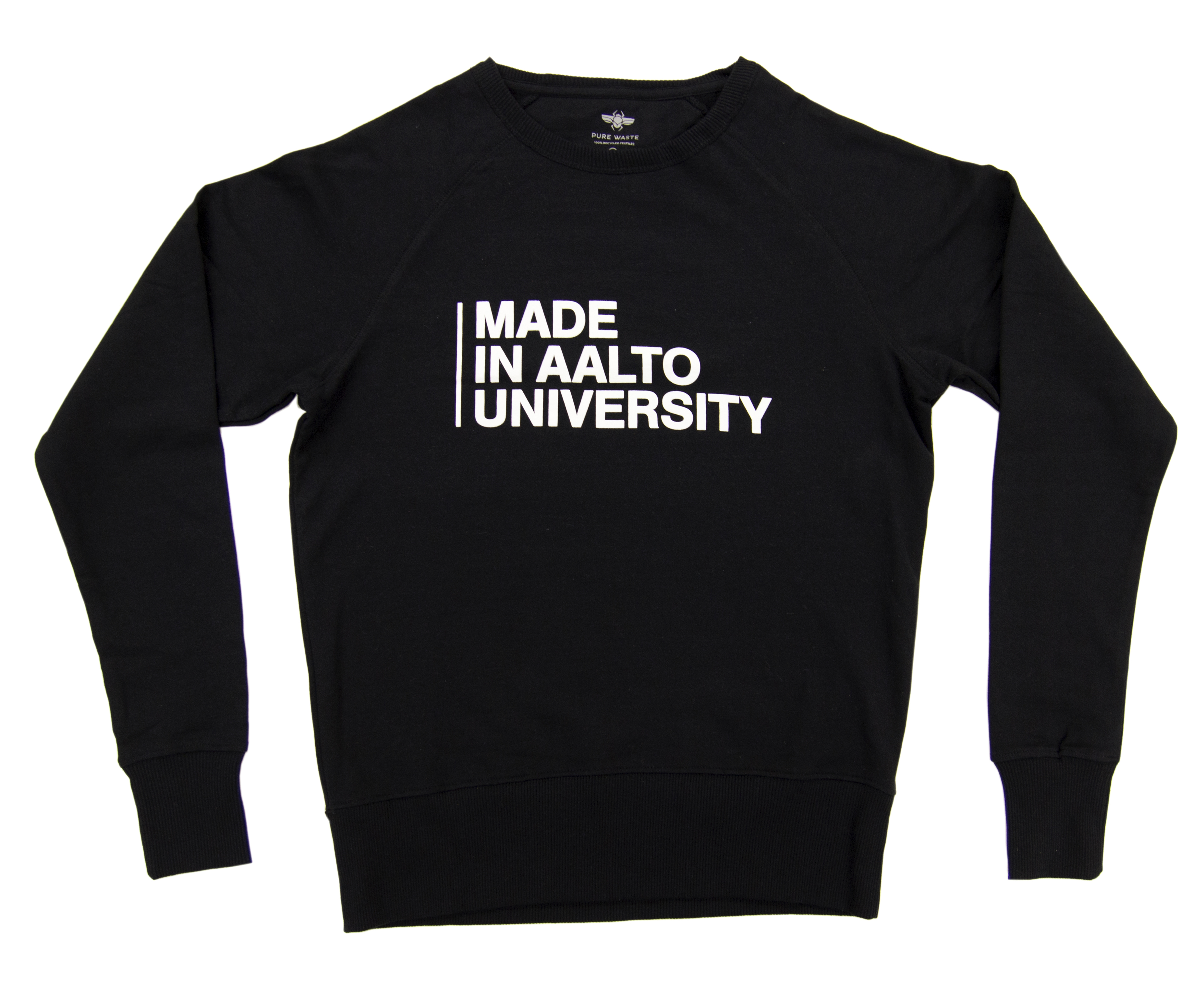Pure Wasten college-paita, jossa valkoinen Made in Aalto University -printti. Paidat valmistetaan kierrätetystä ylijäämämateriaalista ja niitä on saatavilla mustana ja harmaana.